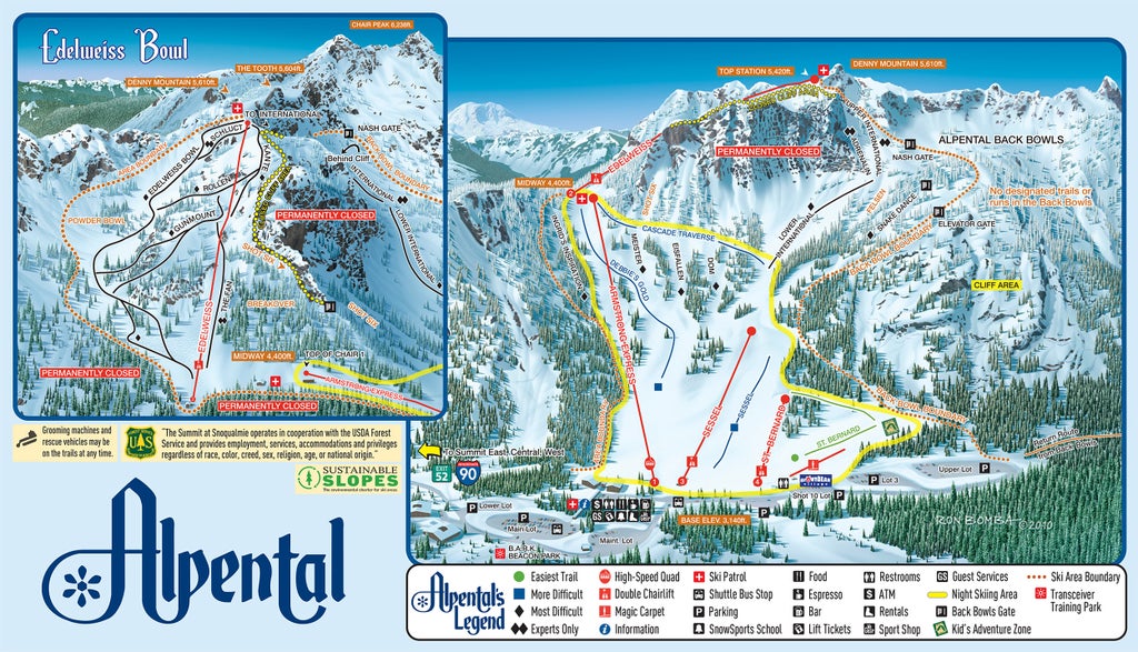 Alpental (German for alpine valley) is one of four base areas at the Summit at Snoqualmie, separated from the other three by Interstate 90. Alpental offers the most advanced and expert terrain at the area with runs like Upper International and Shot Six. The area provides some of the steepest and deepest terrain, but it’s also great for beginner skiers and boarders.