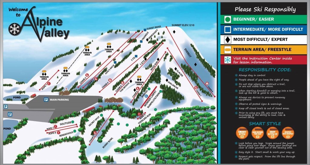 Alpine Valley is the largest ski area in southern Michigan. There are 25 runs serviced by 10 chairlifts and 10 rope tows for various levels of experience. The halfpipe is 350 feet, with verts up to 10 feet high. The terrain park has a variety of ramps, rails and launches....more
