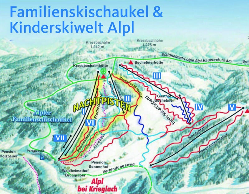 The ski resort Alpl Waldheimat with family-interconnected ski area and a skiworld for children distinguished itself through extreme family-friendly offers. Alpl at Krieglach in the Fischbacher Alps and Roseggers Waldheimat qualifies as one of the most snow safety family skiing areas. Whoever is on vacation in the skiing area Alpl, is can expect very well prepared slopes in every difficulty. Alpl is an eldorado for skiers, snowboarders, cross-country skiers, and snow hikers. Lifts, cross-country ...more