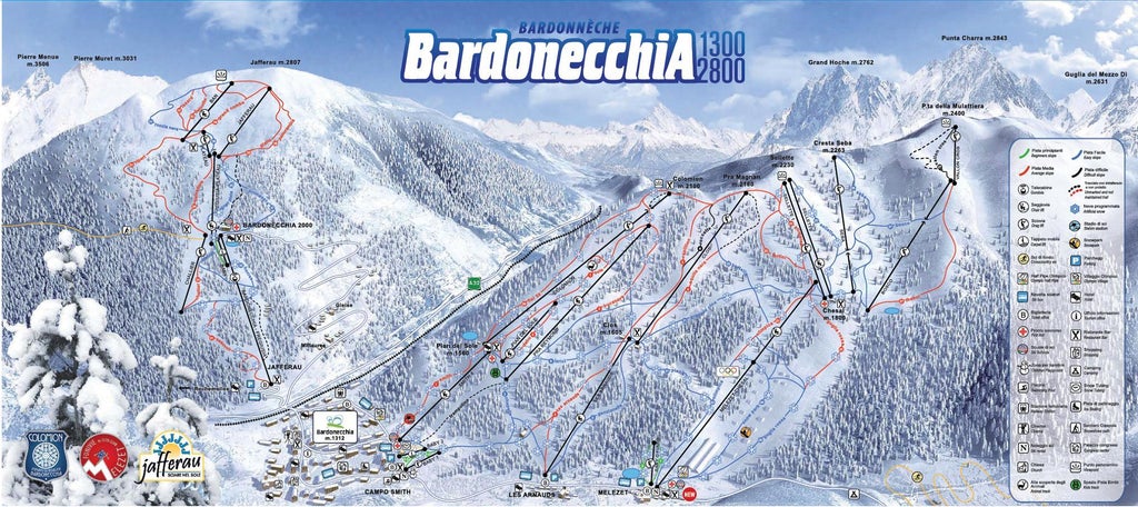 Bardonecchia, with over 100 km of slopes and 23 ski lifts, is made up two ski areas. On one side there's the area that includes Colomion, Les Arnauds and Melezet, which is characteristized by wide slopes that cut through the forest. A thick and artistic spider web of slopes connects Campo Smith (1330 m) in the center of town to the vast plateaus of Vallon Cros, which at 2400 m of altitude is above the treeline.