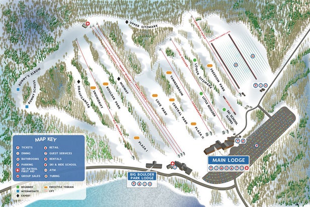 Big Boulder has been ranked as one of the “Top 5 Parks in the East” by Transworld Snowboarding. With its over 400 feet of drop, array of trails and multiple terrain parks, it is a crowd pleaser. In fact, Big Boulder devotes 50 percent of its acreage to freestyle terrain. The resort is located Pocono country, and the ski area's sister is Jack Frost.