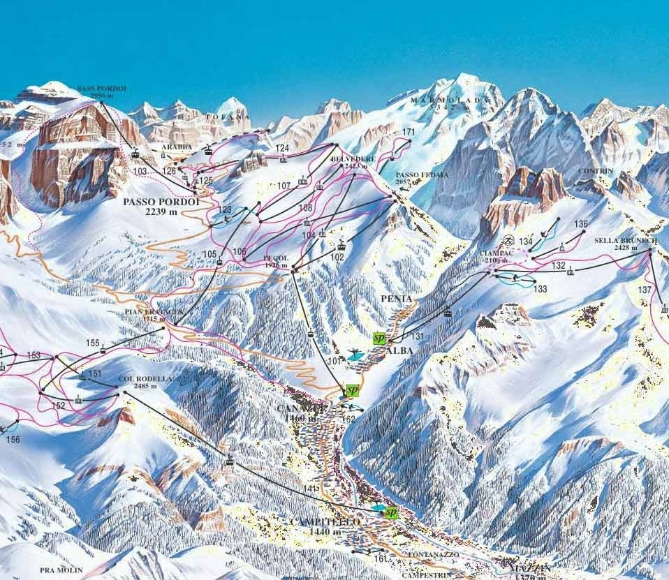 Canazei is nestled in a conch surrounded by the best-known peaks of the Dolomite Mountains and is one of the most famous ski areas in the Alps. It belongs to the Dolomiti Superski ski area and boasts four ski resorts: Belvedere, Ciampac, Col Rodella e Marmolada which cater to ski and snowboard enthusiasts of all levels.