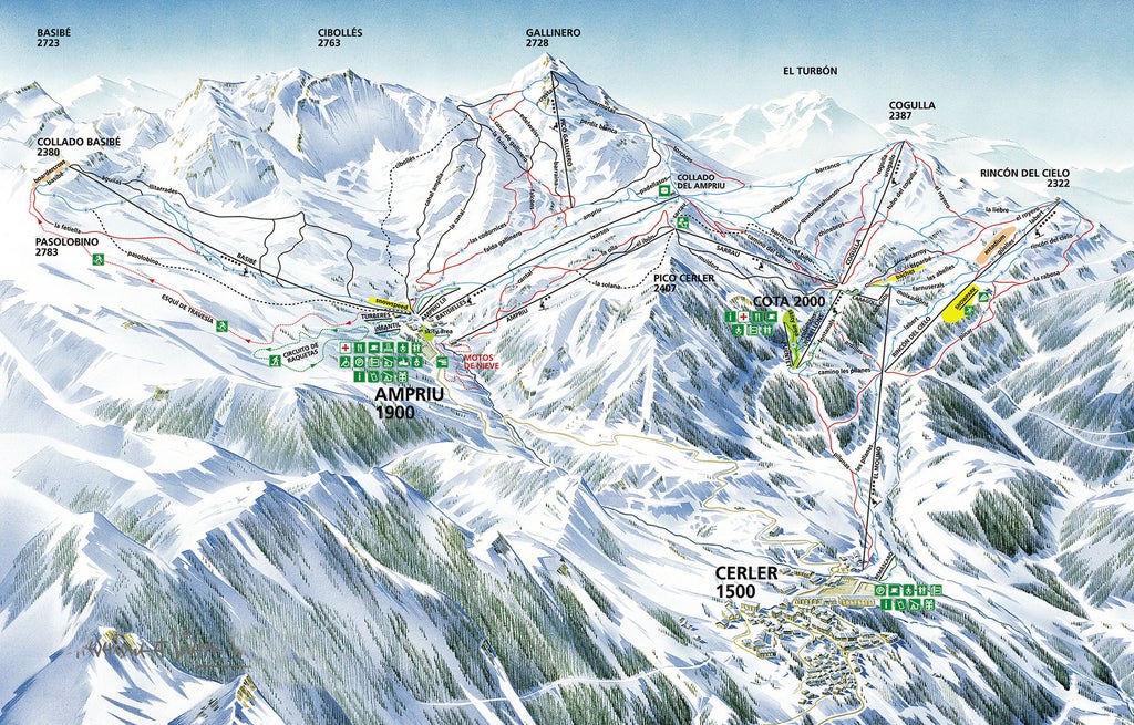 Cerler is located in the Pyrenees in the Benasque Valley, in the province Huesca. Cerler is at an altitude of 1500 m with lifts going up to 2630 m. The ski resort is divided in 3 ski areas: Ampriu, Cerler and Rincón del Cielo. There are 18 lifts (9 Chairlifts, 4 Surface lifts and 5 Magic Carpets) and 56 pistes (8 green, 15 blue, 22 red, 11 black and 5 Ski Routes). The combined skiing area is 52 km. The lift capacity is 24810 skiers/hour. Cerler also offers 1 Snowpark and Ski-Doo circuit. The ski...more
