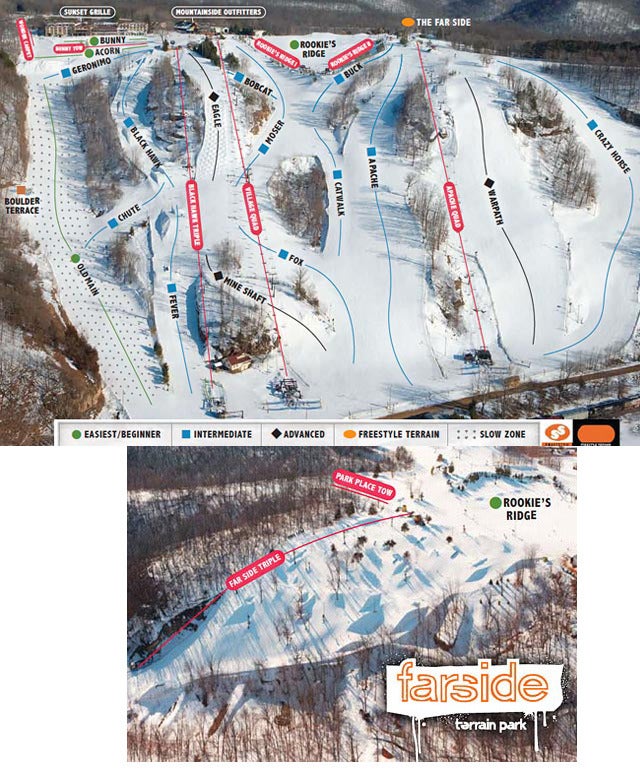 The seven-acre Far Side Terrain Park, complete with its own triple, features a quarter-pipe, two halfpipes, and lots of rails, kickers and jumps. Chestnut, with the hotel and Village Ski Center located on top of the ski hill, features a 475-foot vertical dro...more