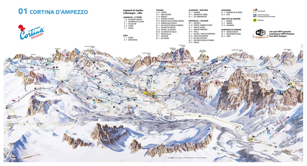 Cortina d'Ampezzo has been a winter sports mecca since the 1930's, and in 1956 it hosted the first Italian Winter Olympic Games. It is known as the Queen of the Dolomites and is located in the heart of the eastern part of these spectacular mountains, in the Belluno province of the Veneto region. The area, open and sunny, boasts stunning views in every direction. One of the best-known ski resorts in the world, Cortina lives up to its reputation with a system of modern ski lifts and snowmaking cap...more