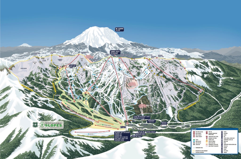 Crystal Mountain offers 2,600 acres of accessible terrain (2,300 acres of which are lift served). Skiers and riders will find everything from relaxed groomers to challenging advanced terrain. Expansive backcountry parallels the open boundary policy for experts.
