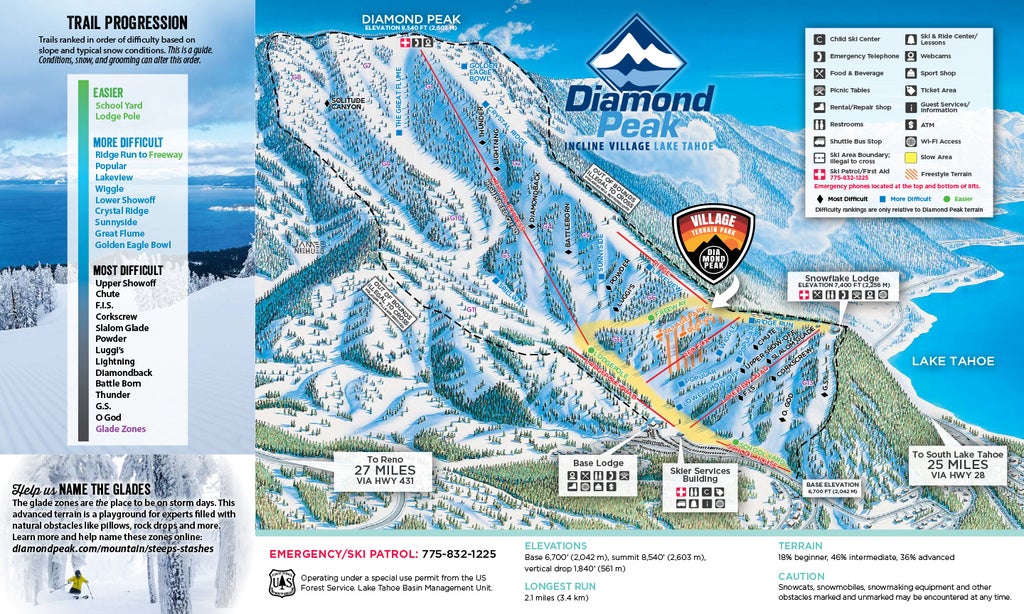 Diamond Peak has a vertical drop of 1,840 feet with a high base and summit elevation that captures plenty of snow. It is located at Incline Village on the North Shore of Lake Tahoe. Diamond Peak has an average annual snowfall of around 325 inches and just about 655 acres of skiable terrain. You will find 30 trails, plus open bowls, and tree skiing areas....more