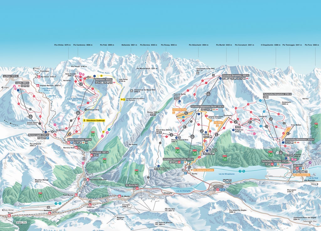 Pontresina is located in the highest-altitude valley that branches off from the Upper Engadine, and ascends from 1,777m to 1,860m above sea level. It's a sunny place, protected from the winds, and lies on a slope opening towards the southwest. While Pontresina is a trendy and open-minded place, it continues to maintain its tradition and cultural roots. Any skier will encounter perfect conditions on the Engadine's neatly prepared pistes. The Diavolezza, Piz Lagalb, Languard, Muottas Muragl, Corva...more
