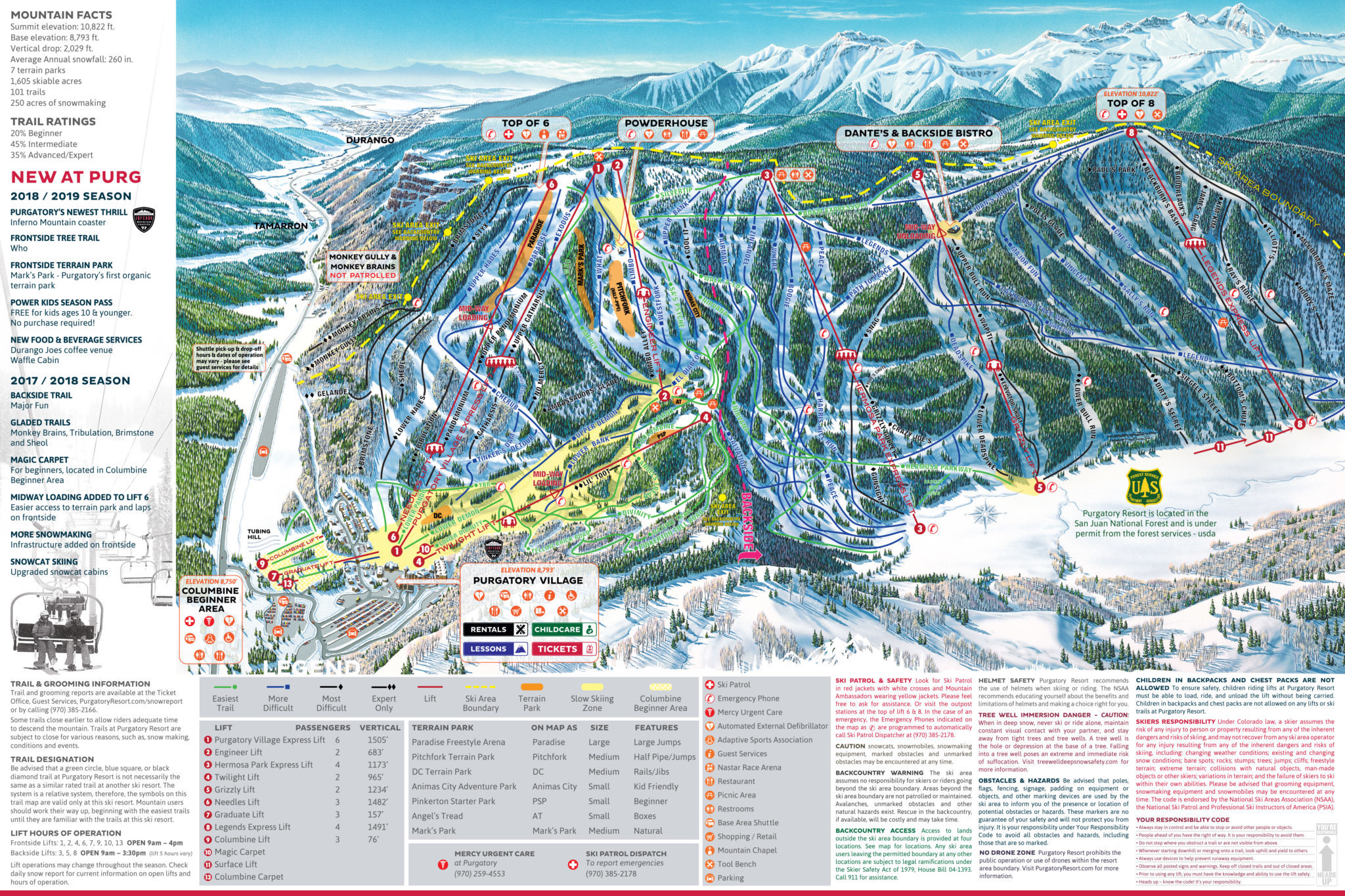 Averaging 260 inches of snow a season, Purgatory Resort offers 1,605 acres of skiable terrain. The resort’s 12 lifts allow visitors to access 101 trails and 7 terrain parks.