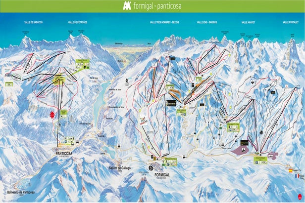 Formigal is located in the Pyrenees in the province Huesca. Formigal is at an altitude of 1500 m with lifts going up to 2250 m. The domain is divided into 4 Valleys/Ski Areas: Valle Tres Hombres-Sextas, Valle de Izas-Sarrios, Valle Anayet y Valle Portalet. There are 22 lifts (11 Chairlifts, 7 Surface lifts, 4 Magic Carpets) and 91 pistes (7 green, 16 blue, 30 red and 38 black). The combined skiing area is 137 km. Formigal also offers 4 Ski Routes, 2 Snowparks, 1 Boardercross/Skicross area and ...more