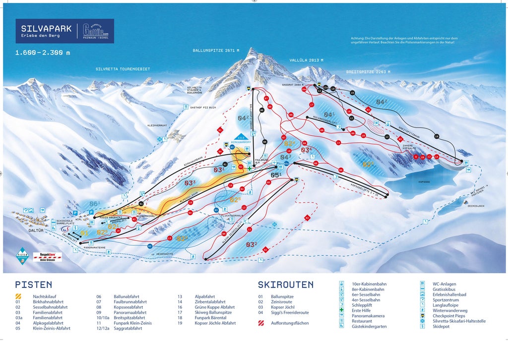 The ski area Galtür - Silvretta (Silvapark) in Galtür, the highest elevated place at the end of the Paznauntal on 1600 m offers well-groomed pistes and a stunning view. The slopes in the ski area Silvretta Galtür are suitable for all levels of difficulty.