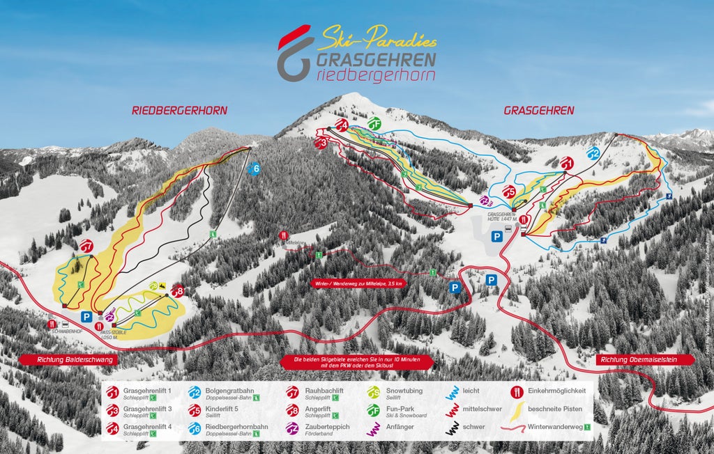 The ski area Grasgehren is a popular destination in the Allgäu for winter vacations because of it’s snow-reliability that goes along with the altitude of 1400 m to 1700 m. The slopes in Grasgehren are well-prepared and served by modern lifts.