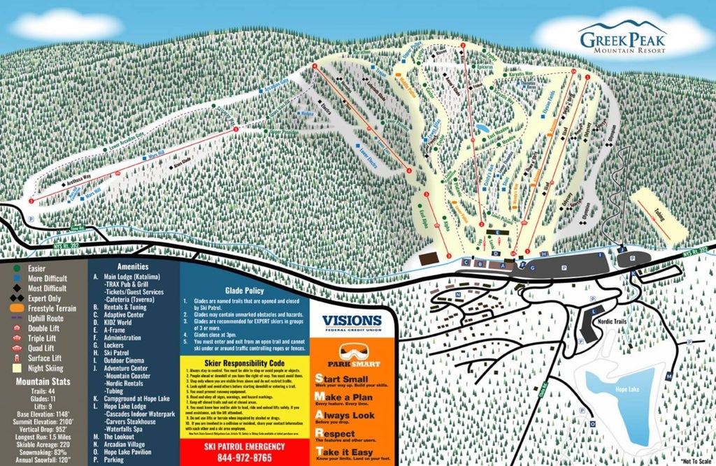 Greek Peak Mountain Resort, central New York’s largest ski resort, was founded in 1958 and has remained at the leading edge of the ski industry with forty-three ski trails and ten glades, six chair lifts, two surface lifts, a beginners’ slope, and terrain parks. The four-season family resort is located in New York’s scenic Finger Lakes region, conveniently just minutes from Interstate I-81....more