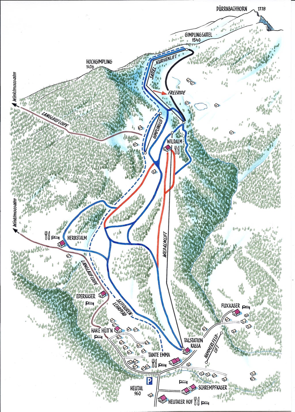 The straightforwardness skiing area Heutal got several lifts, the highest one is leading almost to the Dürrnbachhorn (1776 metres) onto a highness of circa 1520 metres. There are several kilometres of prepared tracks to use and whoever is going to ski in Heutal, gets very well prepared slopes in easy and middle difficulty.