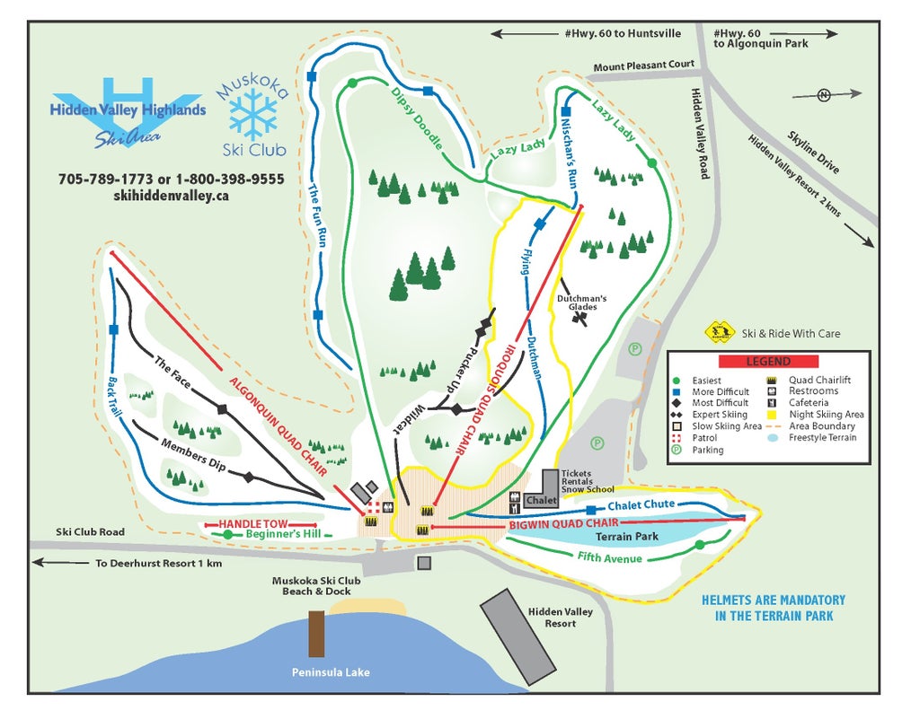 Hidden Valley Highlands Ski Area, located in Hunstville, Ontario, has been a family favorite ski and snowboard area for over 40 years. The ski area is home to gentle, cruising slopes for beginners and intermediates as well as challgneing runs and a terrain park for advanced skiers. The ski area averages 125 inches of annual snowfall, has 90% snowmaking and a vertical of 333 feet. Guests can enjoy slope-side accomodations at the resort as well as great dining options in The Birches Restaurant....more
