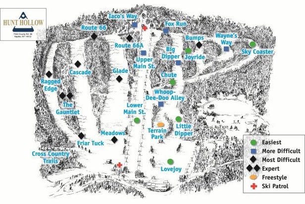 Located near Naples, New York, Hunt Hollow Ski Club offers 400 acres of accessible winter recreation space. With an 825-foot vertical drop, a triple-chair, double-chair, T-bar and a surface lift service the alpine trails. 2.5 miles of Nordic trails and a terrain park are available for your cross-country fans and freestyler....more