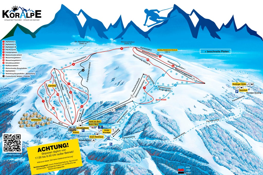 The skiing area Koralpe is located at 1550 to 2070 metres, also called the first two thousand-metres-mountain in the south-eastern alps and it has numerous very well prepared skiing slopes in all difficulties – from the practice slope for beginners, a wide carving track for newcomers and advanced persons to a freeriding-area for professionals or those who want to try it offside the prepared slopes.