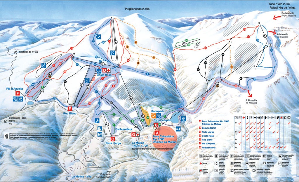 La Molina is located in the Pyrenees in the province Girona. La Molina is at an altitude of 1700 m with lifts going up to 2445 m. There are 16 lifts (1 Gondola, 8 Chairlifts, 5 Surface lifts and 2 Magic Carpets) and 46 pistes (12 green, 13 blue, 15 red, 6 black) with a combined skiing area of 53 km. La Molina also offers 3 Ski Routes, 1 Snowpark and activities such as Snowshoes, Dog-sledges, Ski-Doos and a Sledge Area. La Molina is part of the Alp 2500 Ski Domain together with Masella. The Alp 2...more