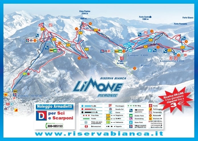 To access the Riserva Bianca (White reserve), the district of the Vermenagna Valley, situated at the foot of Colle di Tenda, there are three “doors”: that of the Sole (Sun), in town, that of Tre Amis (Three friends), at Quota 1400 and that of the Alpe (Alp), at Limonetto. The town also offers access to the Maneggio area, dedicated to beginners. The Riserva Bianca (White reserve) can satisfy downhill skiing enthusiasts thanks to its 80 km of runs covered almost entirely by artificial snow systems...more
