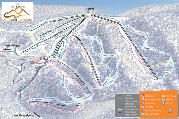Probably the only ski area in the world to have a website leading in with a Woody Allen quote, Mont Aigoual is also famous for its observatory and is a major year round mountain sports destination, especially with bikers in the summer. Skiing is divided in to a nursery area with blue and red runs across the ridge running parallel to one another....more