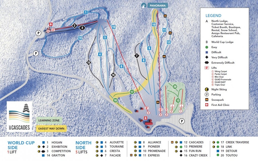 Mont Cascades is a family ski center in the National Capital Region. It is geared towards all levels of skiers and snowboarders. The resort is comprised of 20 runs (15 of which offer night skiing), 60 acres of skiable terrain and 95% snowmaking coverage on its terrain. Mont Cascades Resort allows online ordering, a full rental and repair shop, on-site shopping boutique and a great ski and snowboard school....more