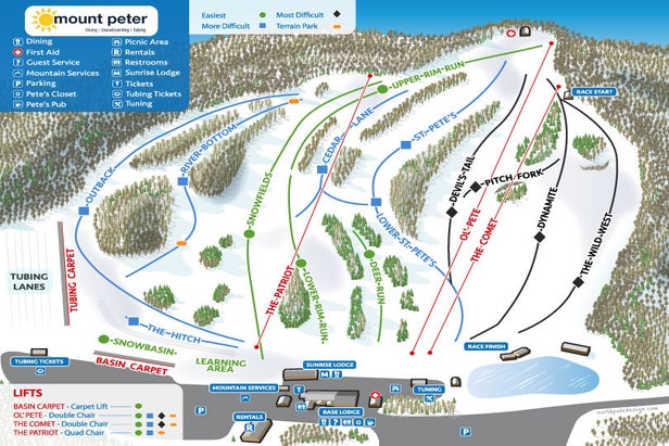 Mt. Peter, with a vertical of 400 feet, has 69 day/night skiable acres. The runs are almost equally divided between beginner (30 percent), intermediate (35 percent) and advanced (35 percent). There's a learning area with a handle tow, called "The Hub," located a few steps from the lodge....more
