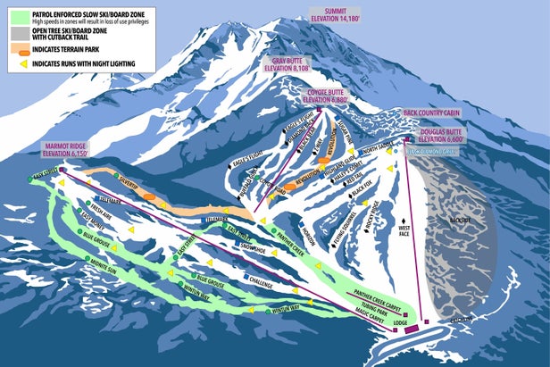 Mt. Shasta Ski Park is located about 6 miles south of California’s 14,162’ stratovolcano Mount Shasta, in the Cascade Mountain Range of North America’s Pacific Northwest. Mt. Shasta Ski Park has chairlifts running up to the top of Marmot Ridge, Douglas Butte and Coyote Butte, with summits of 6150,’ 6567,’ and 6880' respectively. Mt. Shasta Ski Park has terrain that caters to all abilities with 20% beginner, 55% intermediate and 25% advanced skiing spread out over 1,390’ of vertical and 425 acres...more