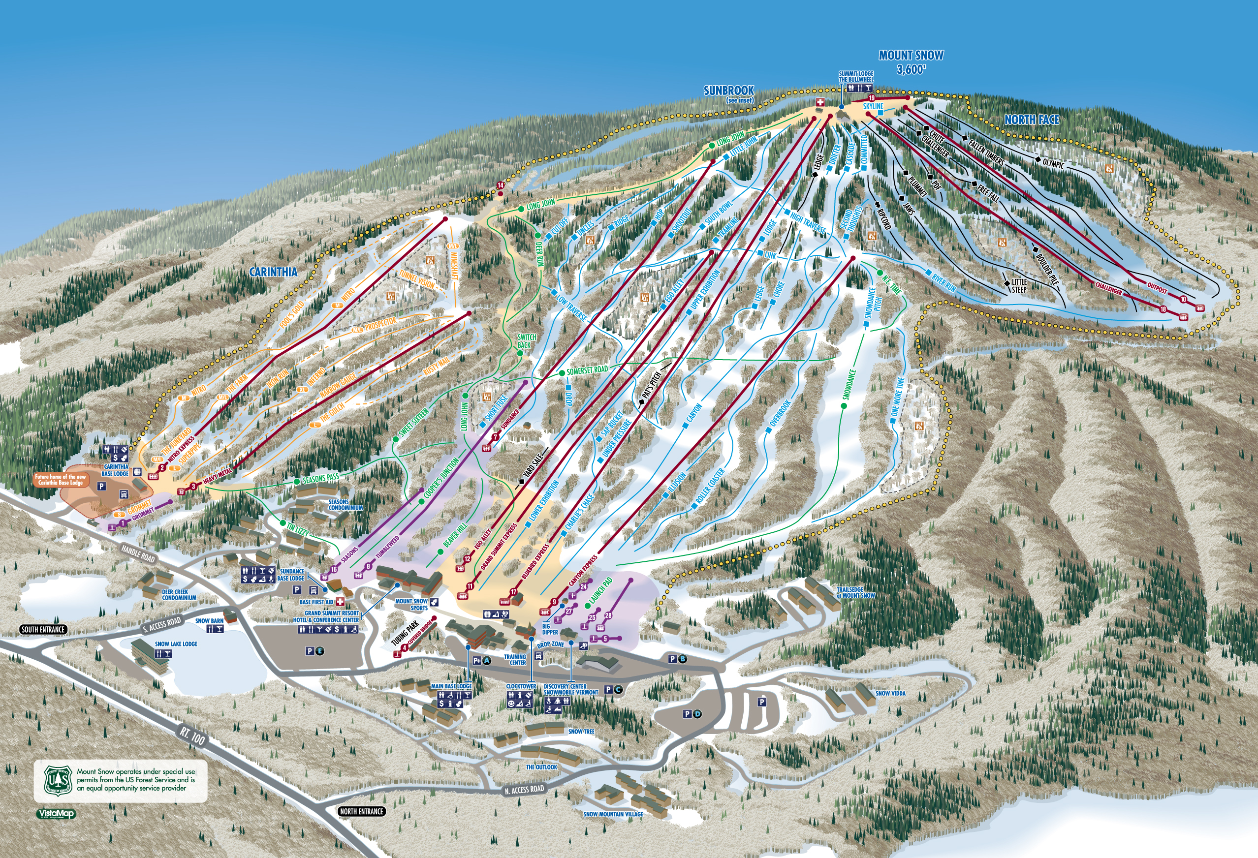 Skiers and riders have access to 600 acres, serviced by 20 lifts. The Bluebird Express lift, Mount Snow’s six-person bubble lift, transports skiers and riders to the resort’s summit elevation of 3,600 feet. But it’s all downhi...more