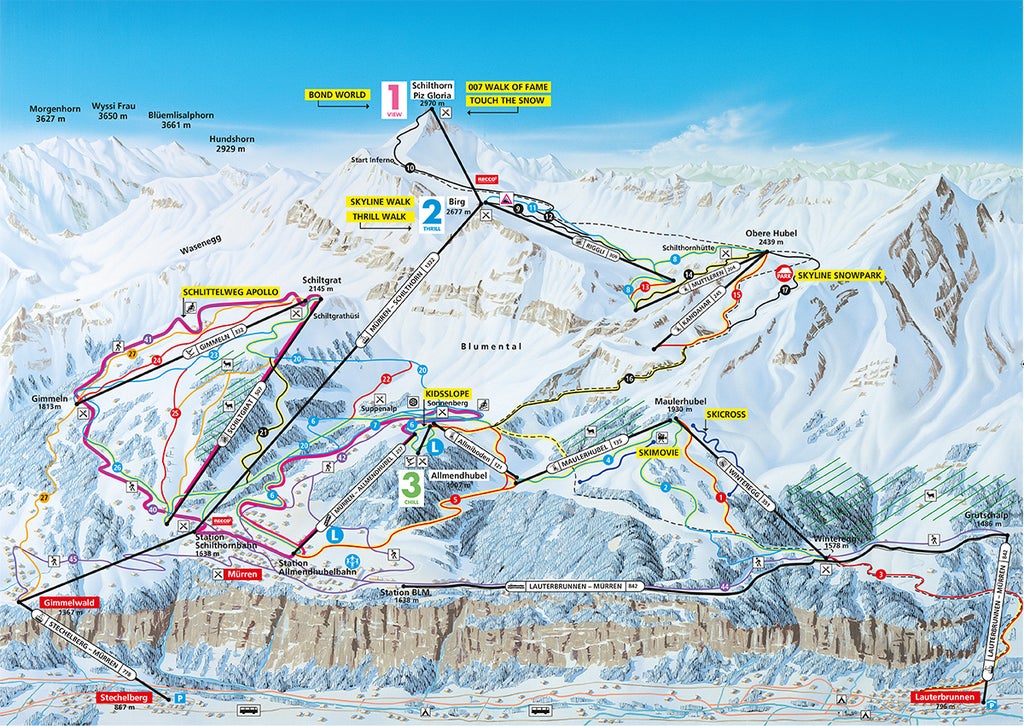 On a ski holiday in Mürren – Schilthorn skiers can enjoy steep slopes and long downhill runs. From the Schilthorn mountain (2973 m), the highest peak in the area, a demanding slope leads down to the family friendly ski village of Mürren and then continues to Lauterbrunnen. On its way it descends 2000 metres in altitude.