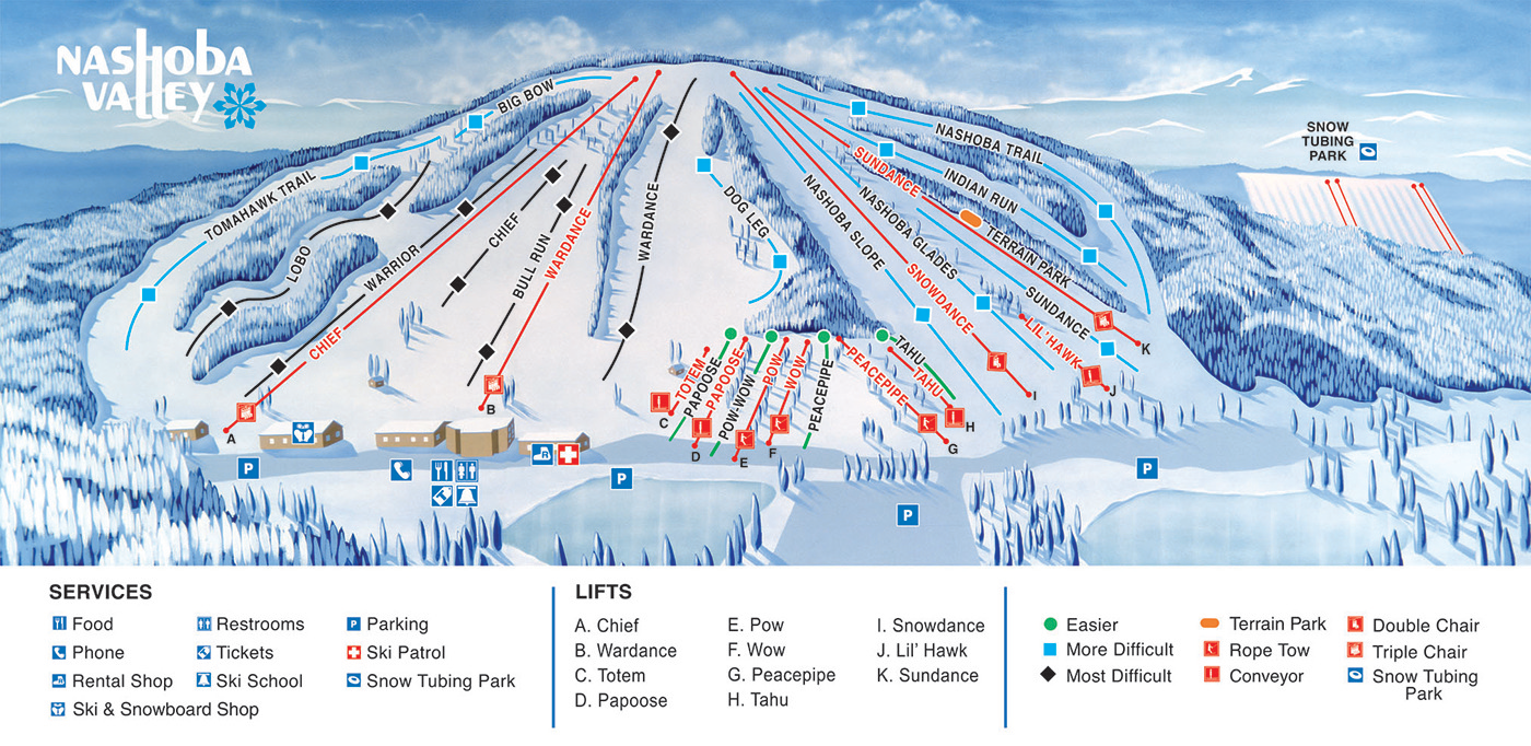 Nashoba Valley is located less than an hour's drive from Boston. This is where Olympic downhiller Pam Fletcher learned to ski and currently serves as marketing director of her family's ski area. Check out The Overlook Restaurant & Bar...good food, fun and a ringside, slopeside seat to the skiing/boarding action. You will find 17 trails and 9 lifts. Nashoba Valley has a snowboard and tube park....more