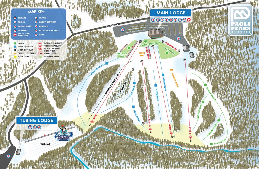 Ski Paoli Peaks is an Indiana favorite. The snowmaking system allows the resort to make 12 inches of snow in one night over the entire 65 skiable acres. Paoli Peaks welcome riders. They have two terrain parks and halfpipe. It draws numerous skiers from Indianapolis, Bloomington (home of IU), and Louisville. There's also a Tubing Park....more