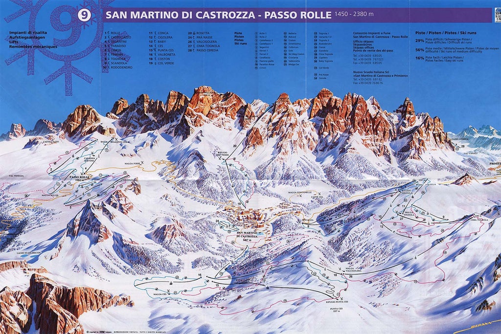 At Passo Rolle (9 km from San Martino - reachable by ski-bus in 20 minutes) you'll find 15 km of tracks from 1900 to 2200 metres in altitude with 5 chair-lifting systems and a ski-lift. Tracks range from easy to tough, from short to long. The snow conditions (natural and, when necessary, artificial) are perfect from the end of November to the end of April.