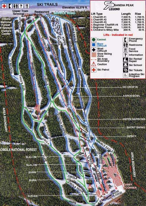 Sandia Peak sits high above Albuquerque and boasts perhaps the nation's easiest ski resort access from a major city via a 60-person aerial tram that rises more than 4,000 vertical feet in less than 20 minutes. It is New Mexico's oldest ski area and offers beginner and intermediate skiers and boarders some long cruisers. Weekends can get crowded and lifts are old, but a weekday powder dump even can entice experts to sample its slopes....more