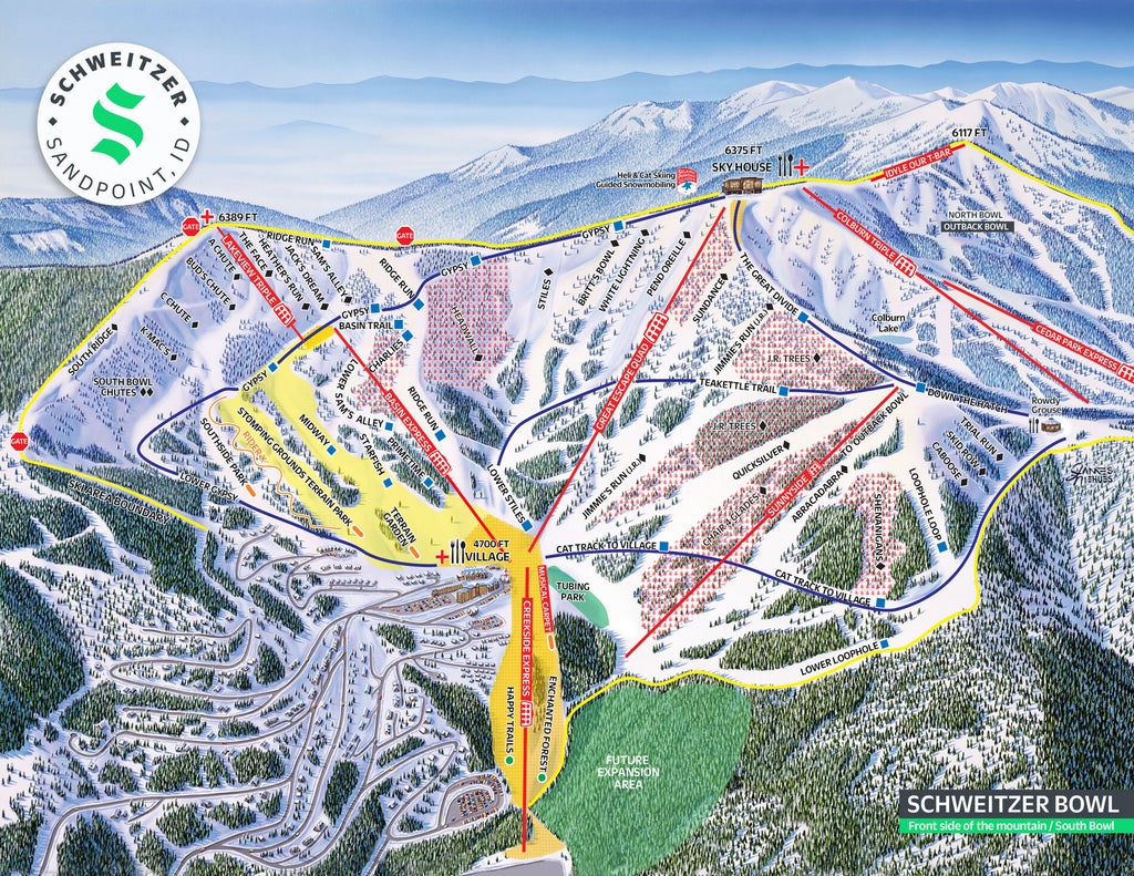 Schweitzer Mountain is considered one of the best family-friendly ski resorts in the Pacific Northwest and offers amazing views of the surrounding town (Sandpoint) as well as of Canada and Lake Pend Oreille.