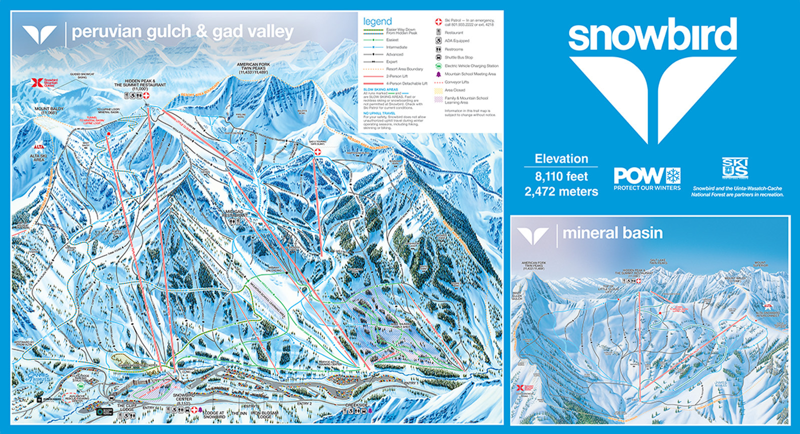 Snowbird’s 2,500 skiable acres are accessible via 1 tram, 10 chairlifts including 7 quads and 3 doubles, and 3 conveyor lifts. The Utah ski resort has a summit of 11,000 feet and a base elevation of 7,760 feet, with a vertical drop of 3,240 feet. Snowbird averages approximately 500 inches of snowfall per year. For skiers and riders looking to develop their skills, Snowbird’s Mountain School is the perfect place to learn, offering everything from private instruction and class lessons to women’s s...more