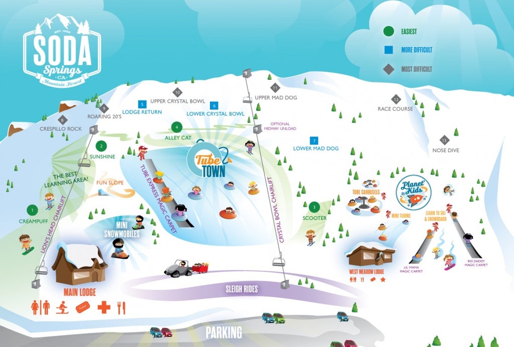 Soda Springs is one of America's original ski resorts, established in 1931. In fact, it’s the oldest operating ski area in California. It has become a cost-saving alternative to the larger Lake Tahoe resorts. It is the first resort located off Interstate 80 in California at the Donner Summit. The resort features two lifts, a tubing carpet and 2 moving carpets. The resort is a favorite among beginners and intermediates.