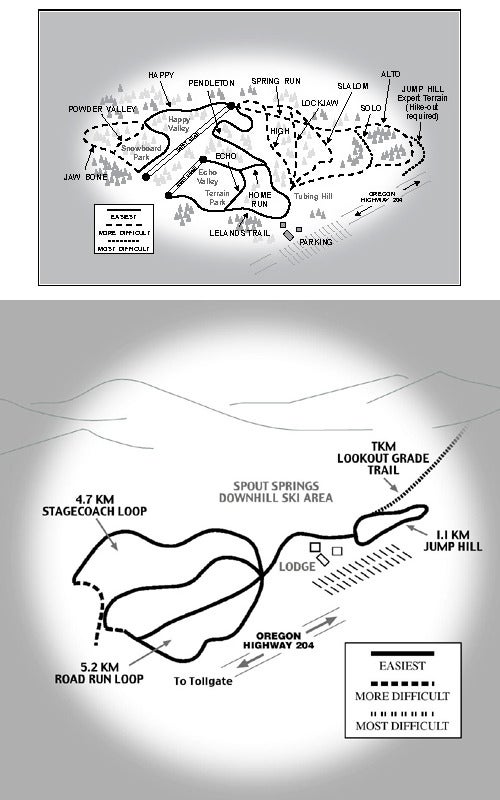 Spout Springs Ski Resort is located in the Umatilla National Forest in the heart of the Blue Mountains in Northern Oregon. The ski area, favored by beginners and families looking for a day on the snow, boasts four lifts serving 11 downhill trails and 21 Nordic tracks on 250 skiable acres. The area's extra-wide runs and well-groomed slopes make it a popular place to learn to ski. Spout Springs is easily accessible on state-cleared, paved highways, right to the area. From Highway 204, look for Mil...more