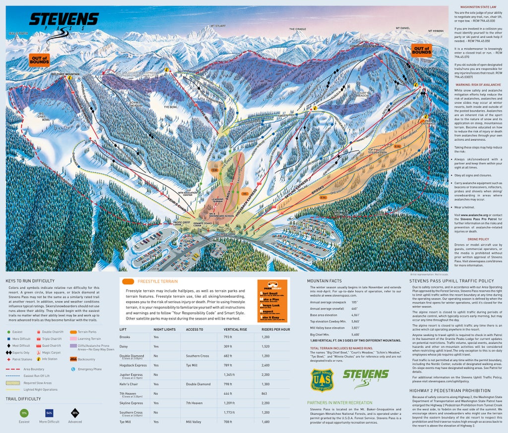 Located on the crest of the Cascade Range, Stevens Pass Mountain Resort is a snow magnet, averaging 460 inches of snowfall a year. The resort’s 80-mile proximity to the Seattle-Tacoma International Airport can have incoming travelers at the base of the mountain within two hours of touching down on the tarmac.