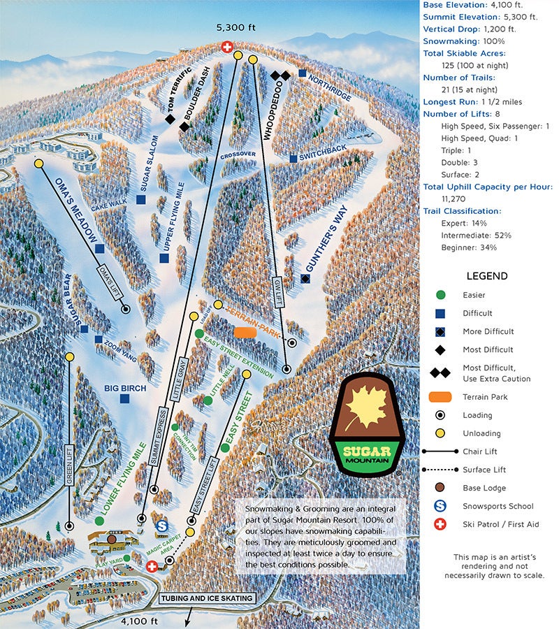 Sugar Mountain sits at a base elevation of 4,100 feet and climbs to a summit elevation of 5,300 feet. The ski area features 125 acres of skiable terrain across 21 trails. Sugar Mountain offers 100% snowmaking coverage and night skiing/snowboarding across 100 acres and 15 trails. Other winter activities include tubing, ice skating and snowshoeing. Lodging options at Sugar Mountain include rooms, condos and homes at the Village of Sugar Mountain.