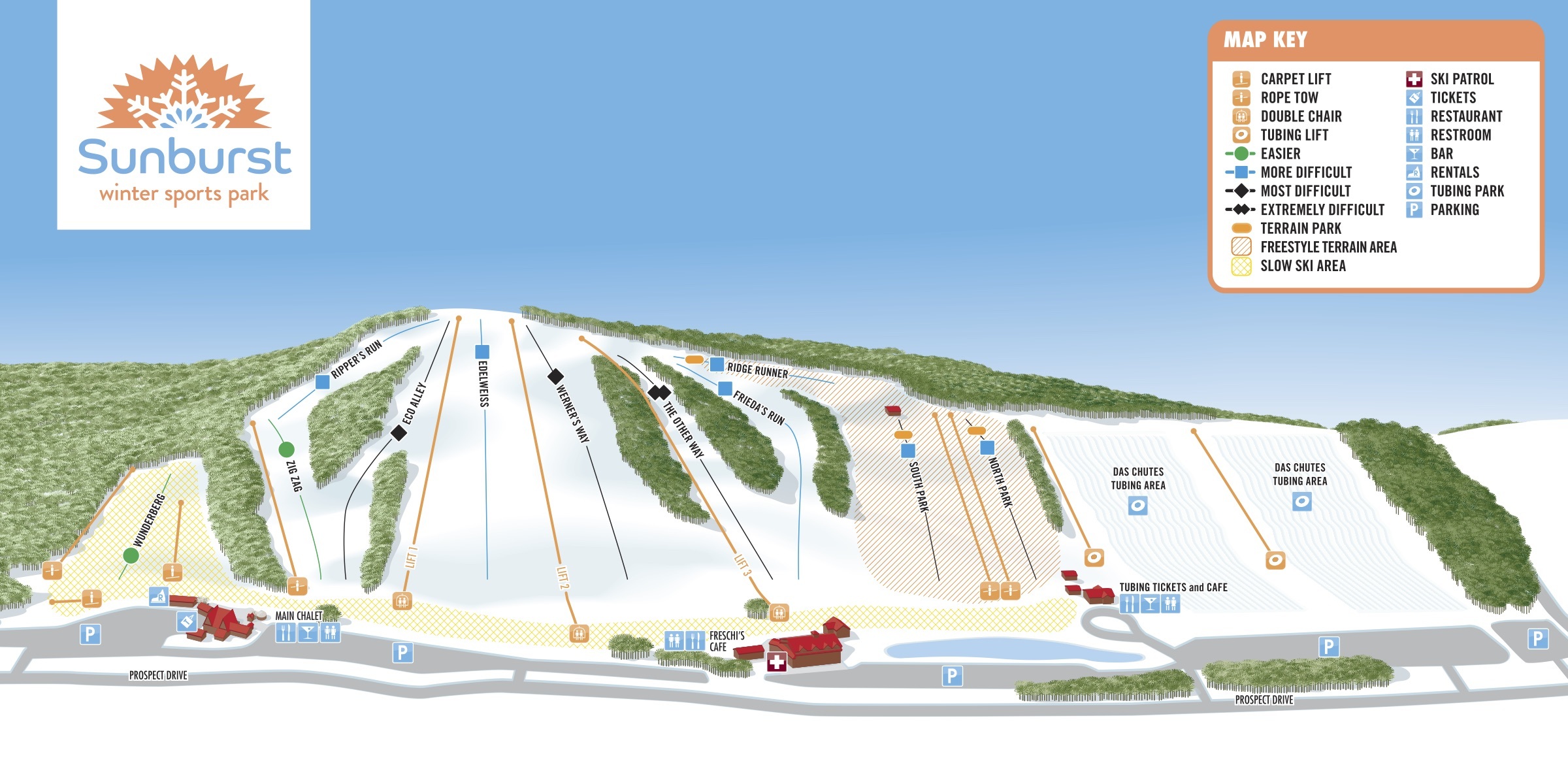 Located just north of Milwaukee, Sunburst is a small ski area with a 214-foot vertical drop is a big hit with families from Beer Town. The ski area provides access to their trails via 4 rope tows, 3 double chairlifts, a 165 foot long Magic Carpet Conveyor, 1 Wonder Crapet, 1 Magic Carpet and 2 Hook Lifts that service the tubing area....more