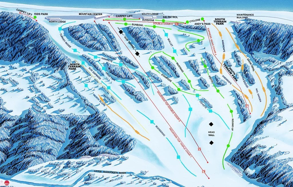 Sundown Mountain offers a variety of challenging skiing and snowboarding terrain in the midst of the Iowa farmland. Located just a few miles from where "Field of Dreams" was filmed, the resort is proof Iowa is not all flat. There's a 475-foot vertical drop with terrain cut out of an old cedar forest that's spread out over 45 acres. From the top of the scenic ski hill you can see three states and the Mississippi River valley. Sundown offers runs to accommodate all levels of skiers plus an expande...more