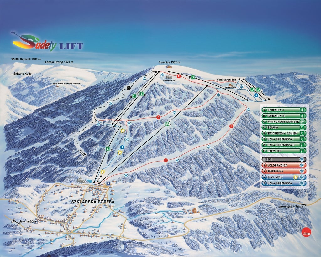 Ski lifts Ski Arena Szrenica is located in Szklarska Poręba. To get to the top of Szrenica (1362 m), you need to use chair lift, which is divided into two sections with total length 2 758 meters. Skiers can take advantage of 4 slopes, one blue, two red and one black with a total length of 10 km. In Szklarska Poreba skiers can without any problems rent sports equipment or use ski or snowboard instructors. Szklarska Poręba offers a range possibility of accommodation....more