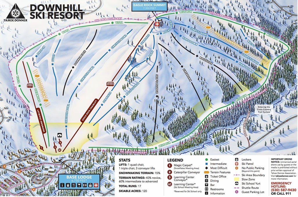 Tahoe Donner Downhill Ski Resort is committed to being "the best place for family fun and learning," with wide-open bowls, uncrowded slopes, great beginner terrain, excellent grooming and a friendly, courteous staff. Enjoy the convenience of a high-speed quad, one triple chairlift and three surface lifts to access 17 runs and over 120 skiable acres at this family resort located just five miles from Donner Lake and less than 20 miles from Lake Tahoe....more