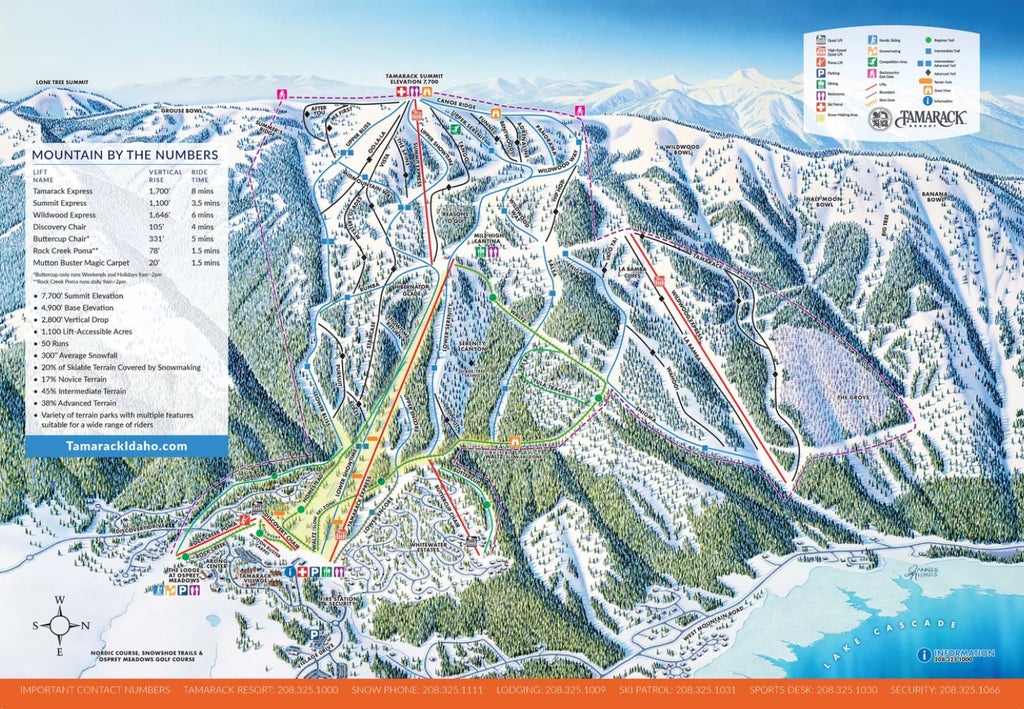Tamarack Resort is a four-season mountain resort that offers alpine skiing, nordic skiing, backcountry skiing and snowshoeing. Tamarack is located on the west shore of Cascade Reservoir, southwest of Donnelly in Valley County, about 90 miles (145 km) north of Boise. Their slope faces East, providing minimal wind with maximum snow retention. Skiers and riders can enjoy diverse terrain that includes glades, steeps, cornices and groomers, spread out over 1000 skiable acres, accessed by 6 lifts. Tam...more