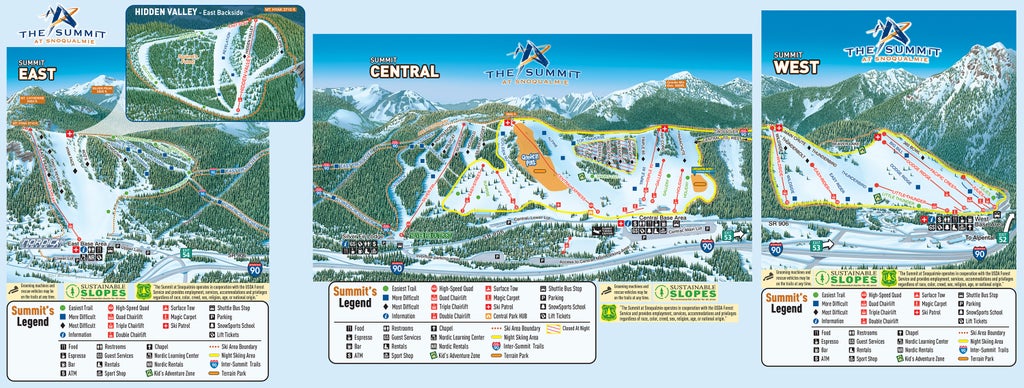 The Summit at Snoqualmie sits 45 minutes east of Seattle on I-90, in the heart of the Mt.Baker/Snoqualmie National Forest. The Summit consists of three base areas: Summit West, Summit Central and Summit East. There are 1,994 acres of terrain with vertical ranging anywhere from 765 feet to 1,100 feet. The average snowfall is 435 inches per year. Summit Central has a superpipe, black diamond to beginner runs, top-to-bottom terrain parks, glades, and tubes. Summit East, open weekends only for alpin...more