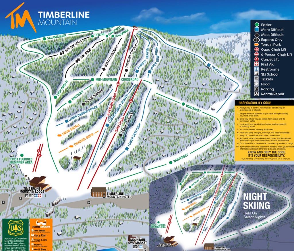 Timberline Four Season Resort is an old West Virginia favorite. The ski area provides skiers and snowboarders a peak elevation of 4,268 feet, 200 inches of average annual snowfall and a vertical drop of 1000 feet. Three lifts service 37 runs spread out over 100 acres of skiable terrain. The resort offers guest the option of staying in their slopeside hotel and great dining in the Timberhaus Cafeteria and Timbers Pub & Fireside Grill....more