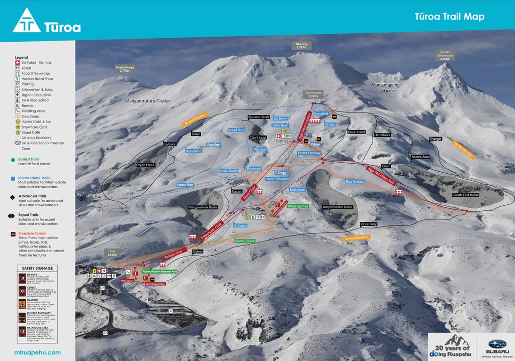 Turoa Ski Area is situated on the south-western slopes of Mt. Ruapehu located on New Zealand’s North Island. Mt. Ruapehu is an active volcano and is the highest point on the North Island. Turoa is known for having the largest vertical drop in New Zealand with a high elevation and consistent dry snow.