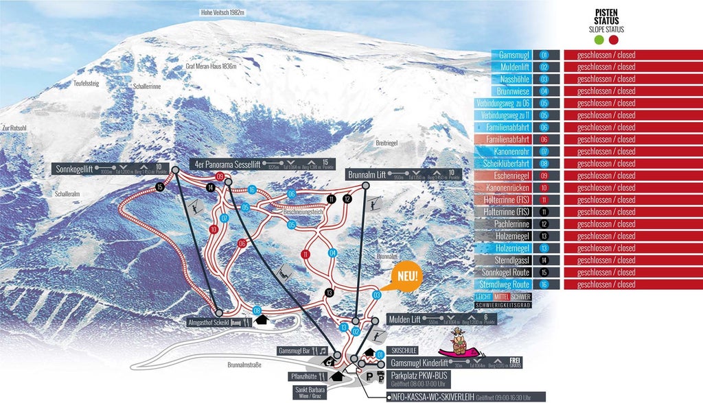 The Hohe Veitsch is located in the Mürzzuschlag- district in Steiermark. The peak, with a highness of 1082 metres is located at the Mürzsteger Alps. The Hohe Veitsch reaches from about 5.5 kilometres from west, where the peak is on a highness of 1981 metres, to the east, where you can find the Klein-Veitsch-Alm.