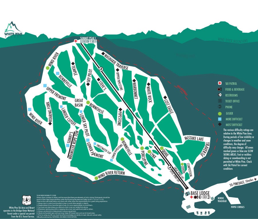 Locally owned and located 10 miles from Pine, Wyoming, White Pine Ski Area offers downhill skiing and snowboarding as well as a free Nordic ski terrain park. Two lifts service groomed downhill runs and the terrain park offers jumps and slides. Approximately 35KM of looping Nordic trails are maintained for all skill levels. Fortification Mountain at Summit Peak One rises to an elevation of 9,500 feet and offers spectacular views of the Continental Divide Wind River Mountains, the Bridger Teton Na...more
