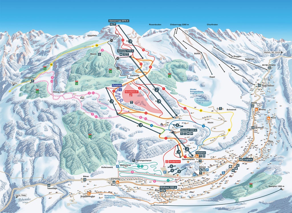 Wildaus lies in the Toggenburg Region, between the mighty Säntis Massif and the imposing peaks of the seven Churfirsten. Toggenburg is Eastern Switzerland's largest winter sports region, and offer more than 60km of perfectly prepared, wide pistes which beckon skiers and carvers. Skiing, carving, snowboarding, telemarking, cross-country, snowshoeing, tobogganing, curling, ice skating, and much more, are enjoyed here. In the uppermost regions of Toggenburg, 19 modern cableways and lifts whisk wint...more